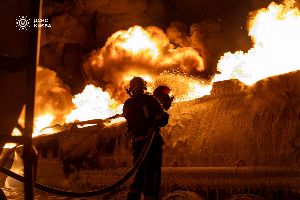Calls came in early as a result of hits on non-residential buildings in the Desnyansky and Holosiivsky districts, followed by a hit on an office building in the Solomianskyi district, and reports of garages on fire in the Dniproprovskyi district, while a medical call was made in the Darnytsyi district.