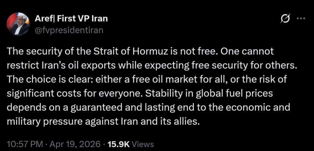 Iranian First Vice President Reza Aref said that the security of the Strait of Hormuz was not free, and one cannot restrict Iran’s oil exports while expecting free security for others, so the choice was clear, either a free oil market for all, or the risk of significant costs for everyone.