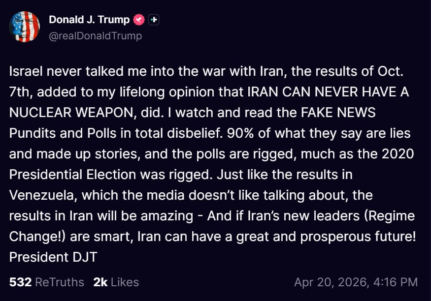 After calling various media outlets, including NYP, CNN, PBS and Channel 12 Israel, President Trump took to Truth Social stating that Israel hadn’t talked him into the war, but it had been his lifelong opinion that Iran could never have a nuclear weapon, stating he had watched and read the fake pundits and polls in disbelief, claiming most of what they said were lies or made up stories and the polls had been rigged similar to the 2020 Presidential Election, concluding that if Iran’s new leaders were smart, Iran could have a great and prosperous future.