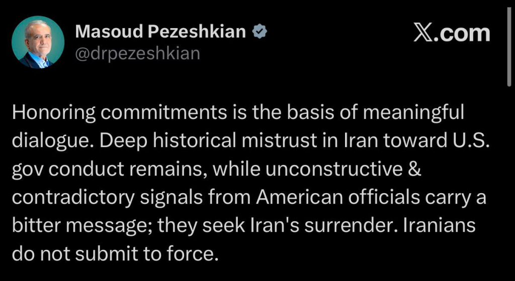 President Masoud Pezeshkian said that honouring commitments was the basis of a meaningful dialogue: “Deep historical mistrust in Iran towards US government conduct remains, while unconstructive & contradictory signals from American signals from American officials carry a bitter message,” he wrote on X, adding that the US sought Iran’s surrender, but Iranian’s don’t submit to force.