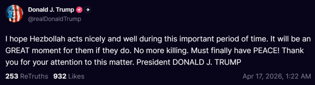 President Trump said on Truth Social that he hoped Hezbollah acted nicely and well during this important period of time, because it will be a great moment in time if they do, with no more killing there must finally be peace.