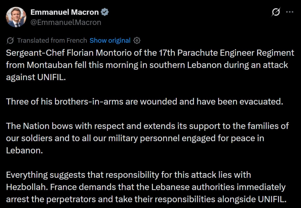 French President Emmanuel Macron took to X to state that Sergeant-Chef Florian Montorio of the 17th Parachute Engineer Regiment from Montauban fell on Saturday morning in southern Lebanon during an attack against UNIFIL, adding that three of his brothers were wounded and had been evacuated.