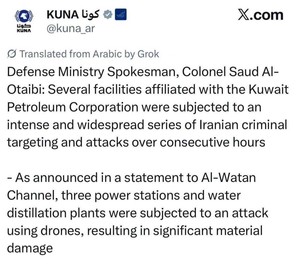 Kuwait’s army said it had also intercepted 28 drones aimed at the country since the morning, with some targeting oil facilities, others targeting power plants, causing heavy damage, which Iranian state television reported was carried out in a response to a strike on oil refining facilities on Iran’s Lavan Island in the Persian Gulf by Kuwait and UAE.
