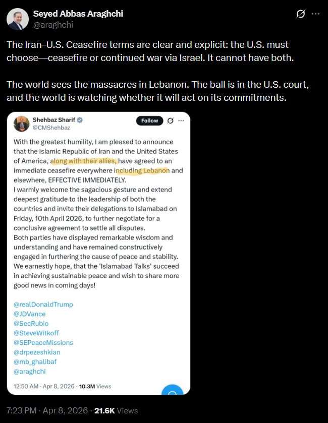 Iran’s FM Araghchi issued a post saying that the ceasefire terms were clear and explicit, so the US must either choose a ceasefire or a continued war with Israel, because it couldn’t have both, noting that the world saw the massacres in Lebanon, and the ball was now in the US court as the world was watching to see whether it would act on its commitments.