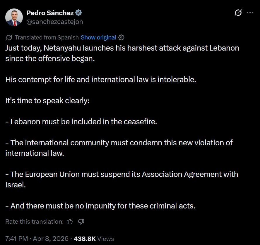 Spain’s Prime Minister Pedro Sánchez said on X that Netanyahu launched his harshest attack against Lebanon since the offensive began, noting that his contempt for life and international law was intolerable, adding that it was time to speak clearly, stating that Lebanon must be included in the ceasefire, the international community must condemn the new violation of international law, the European union must suspend its Association Agreement with Israel, and there must be no impunity for the criminal acts.