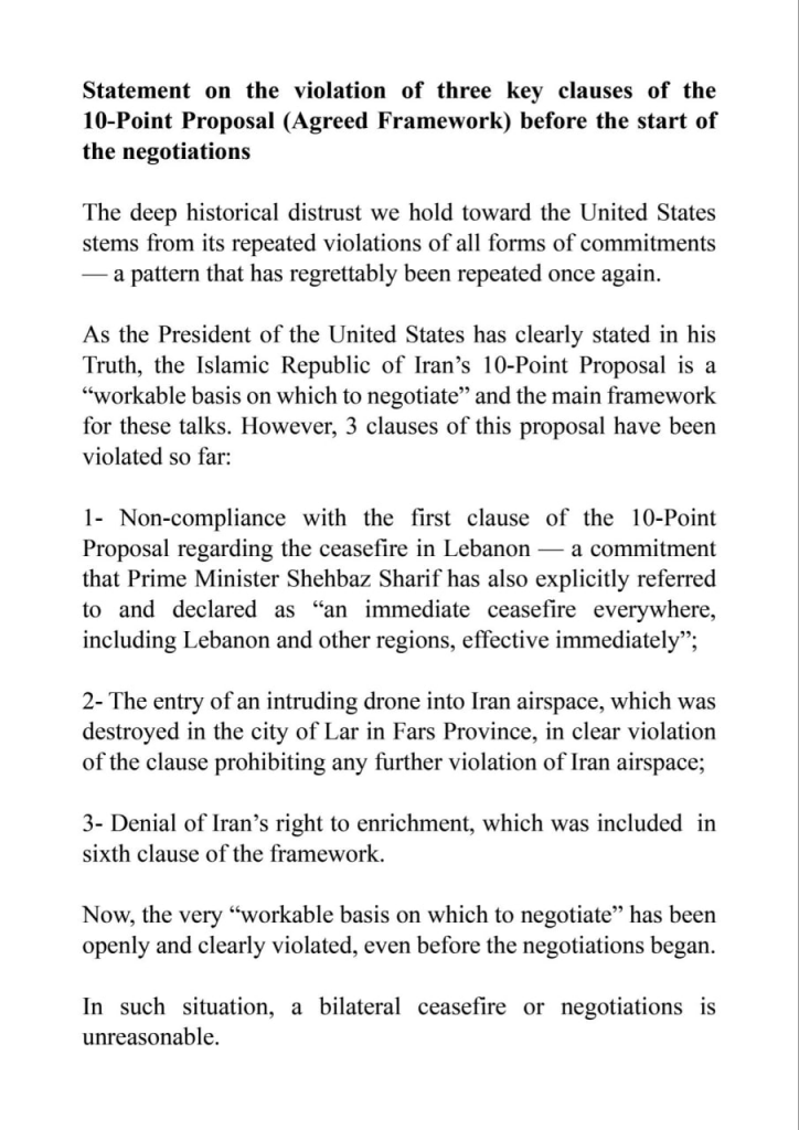 Iranian Parliament Speaker Ghalibaf said the deep historical distrust Iran held towards the United States stemmed from its repeated violations of all forms of commitments, a pattern that had regrettably been repeated once again: “As the President of the United States has clearly stated in his Truth, the Islamic Republic of Iran’s 10-point Proposal is a ‘workable bases on which to negotiate’ and the main framework for these talks.