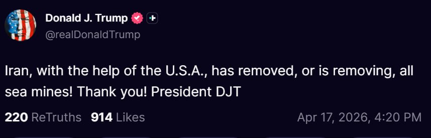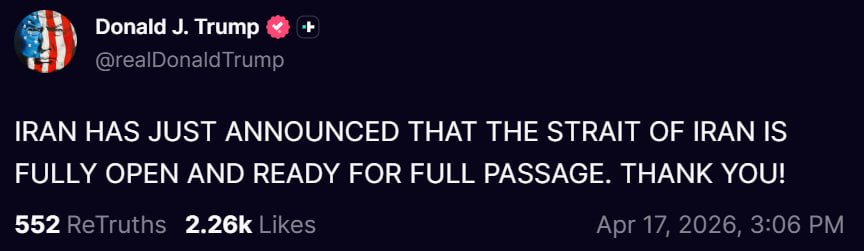 President Donald Trump wrote on Truth Social that Iran has just announced the ‘Strait of Iran’ is fully open and ready for full passage,’ in what was the first of multiple Truths that appeared to inform the Strait was open and free, later clarified by Iran as not the case.