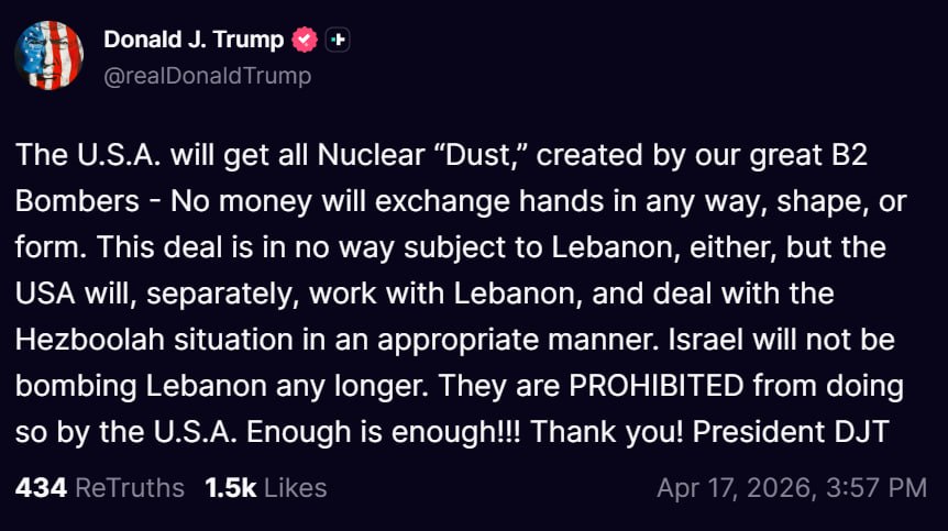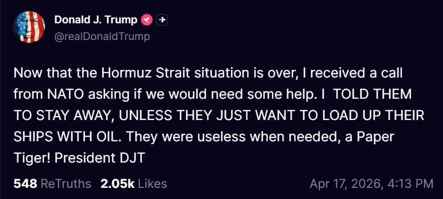 Reuters reported that the USA had offered to release the $20 billion held in foreign accounts and frozen funds as a thanks for opening the Strait of Hormuz, but President Trump later took to Truth Social to say that no payments had been agreed, and when Reuters was able to ask President Trump about the payment, Trump denied it saying: “It’s totally false – no money is changing hands.”