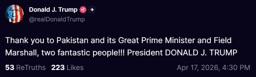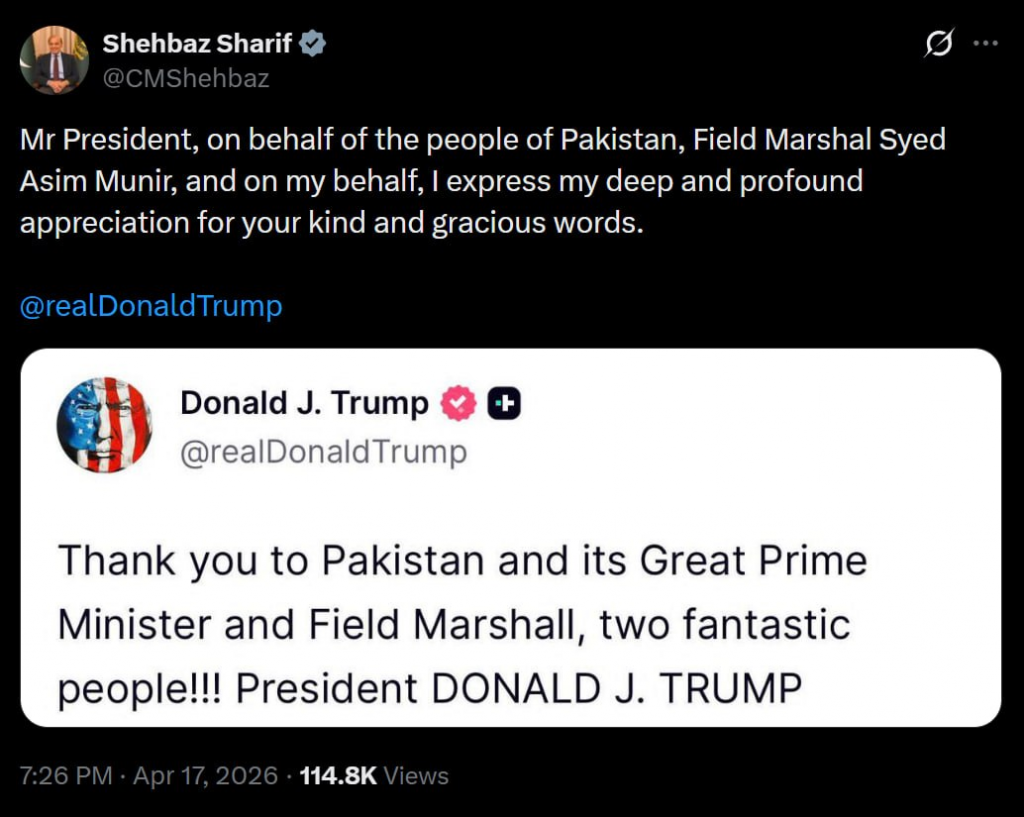 Pakistani Prime Minister responded to President Trump’s thanks on Truth Social, saying: “Mr President, on behalf of the people of Pakistan, Field Marshal Syed Asim Munir, and on my behalf, I express my deep and profound appreciation for your kind and gracious words.”