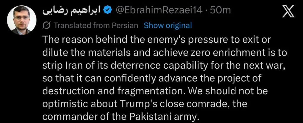 Iranian National Security and Foreign Policy Committee spokesperson Ebrahim Rezaei said that the pressure to end or limit enrichment is aimed to strip Iran of any deterrence, leaving it vulnerable to future war and fragmentation.