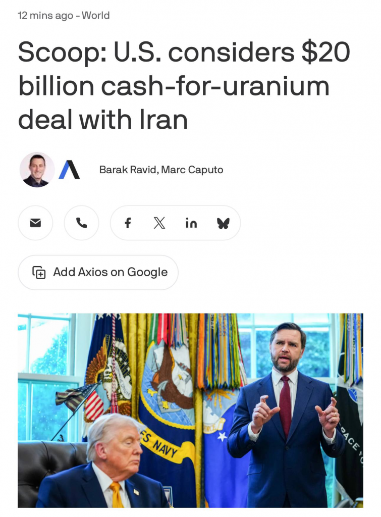 The United States was reportedly considering a deal worth $20 billion in order to purchase the Uranium from Iran, reported Naya News citing Axios, but the reports actually suggested that the US were considering instead releasing the $20 billion in frozen seized assets, again which Trump denied in a Truth Social, as back and forth between the two nations not only continued through mediators, but also through social media.