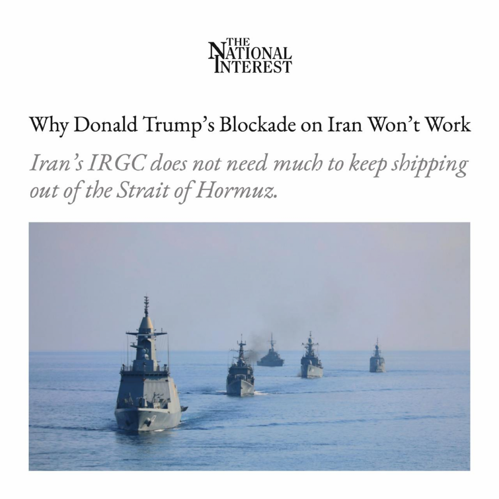 President Trump’s blockade will not succeed against Iran because Iran doesn’t need many facilities to continue exports from the Strait of Hormuz, reported the National Interest, stating that analysts said that even with a naval blockade, Iran could still find ways to continue exporting goods and oil, thanks to the vast geography, military capabilities, and experience in circumventing restrictions.