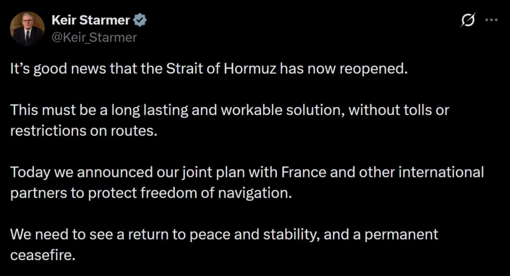 British Prime Minister Sir Keir Starmer said that the UK along with France will lead a multinational mission to protect freedom of navigation as soon as conditions allowed, noting it would be strictly peaceful and defensive as a mission to reassure commercial shipping and support mine clearance, while inviting all nations with an interest in the free flow of global trade to join.