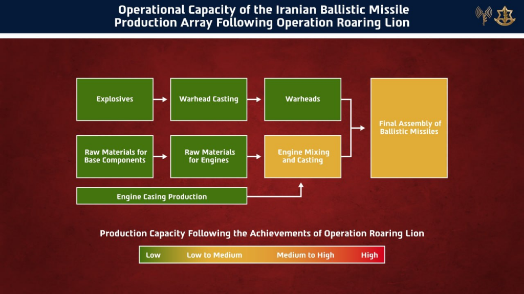 The IDF assessed Iran’s ballistic missile production capability had been downgraded from a ‘high level’ to ‘low’ or ‘low-to-medium’ levels across all major phases, including explosives manufacturing, warhead formation, engine production, and final assembly.
