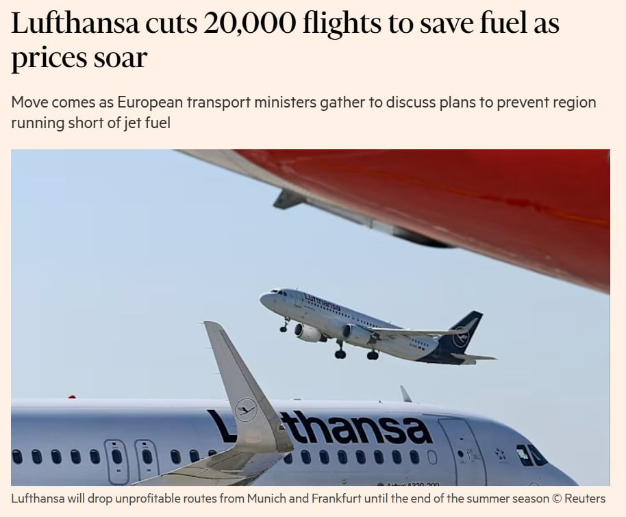 Germany: Lufthansa is set to cancel around 20,000 short-haul flights between May and October, approximately 120 per day, in a major cost-cutting move due to jet fuel prices doubling during the Iran War, reported the FT, stating that cuts were expected to save roughly 40,000 tonnes of fuel and mark one of the largest schedule reductions by a global airline to date in response to rising energy costs.