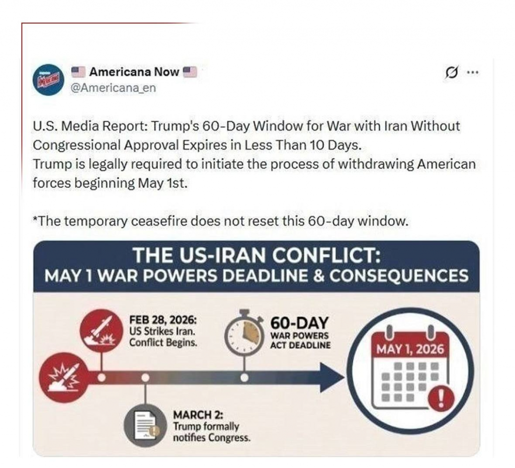 USA: There were just 10 days left until the end of President Trump’s deadline of 60 days for the war with Iran without the need for Congressional approval, which would mean that Trump would legally be obliged to start the process of withdrawing the US forces from the region around May 1, and a temporary ceasefire doesn’t reset the 60 day deadline, IRIB News reported.