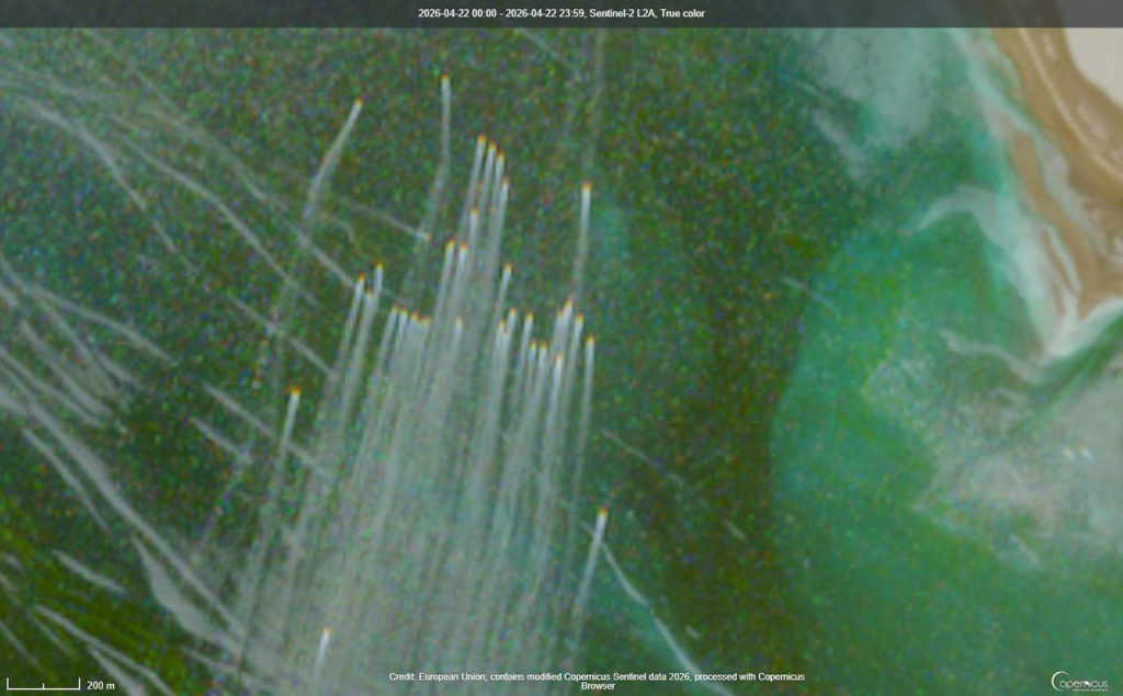 Satellite imagery published by the IRGC and circulated through social media showed a huge swarm of 33 fast attack boats belonging to the IRGC Navy returning to the coast after patrolling in the Strait of Hormuz, contradicting President Trump’s claims the navy had been ‘completely and utterly destroyed,’ and these boats likely took part in Wednesday’s attack on the three vessels in the Strait, seizing two of them.