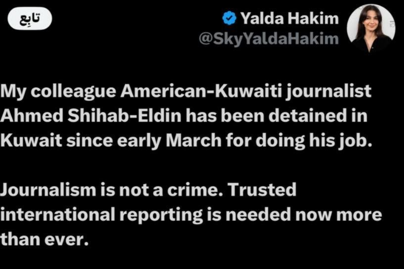Kuwait: Sky News correspondent and media personality Yida Hakeem made a public call for the release of her fellow journalist Ahmed Shihab, who was arrested in Kuwait as a result of his coverage of the recent war.