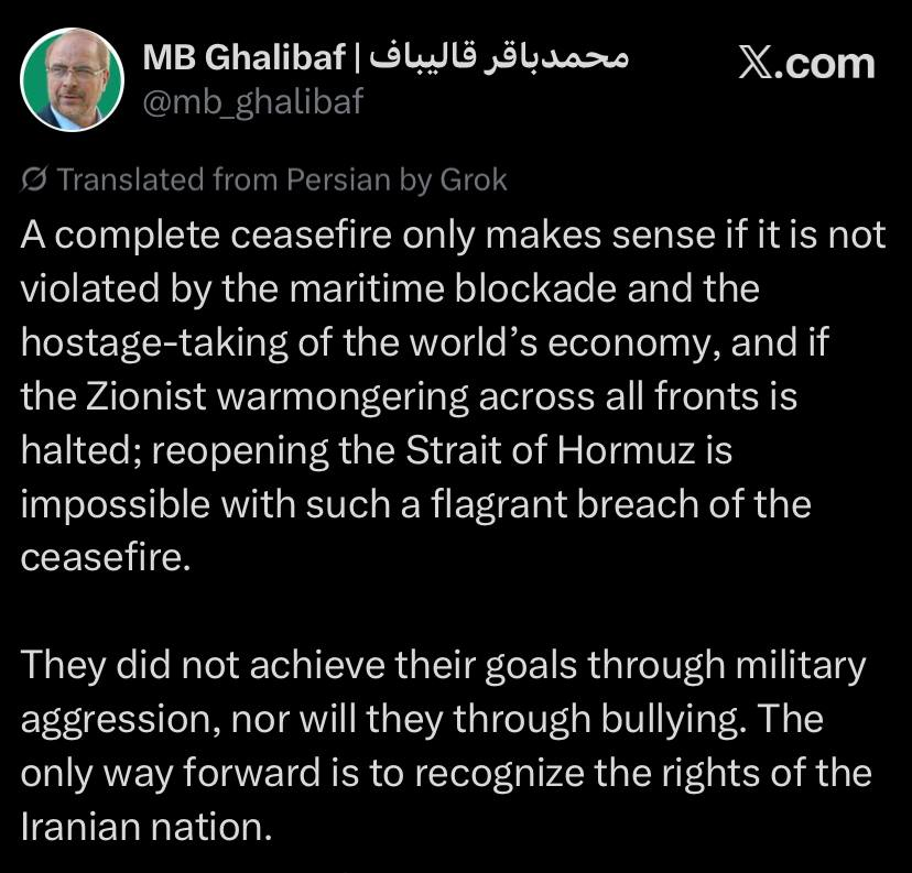 Iranian Parliament Speaker Mohammed Bagher Ghalibaf summed up the day perfectly on X, when he stated that a complete ceasefire only made sense if the US didn’t go and break it by imposing a maritime blockade and taking of hostages, stating that the reopening of the Strait of Hormuz was impossible with such a flagrant breach of ceasefire, adding that the US didn’t achieve their goals through military aggression, and they wouldn’t succeed with bullying, so the only way forward was to recognise the rights of the Iranian nation.