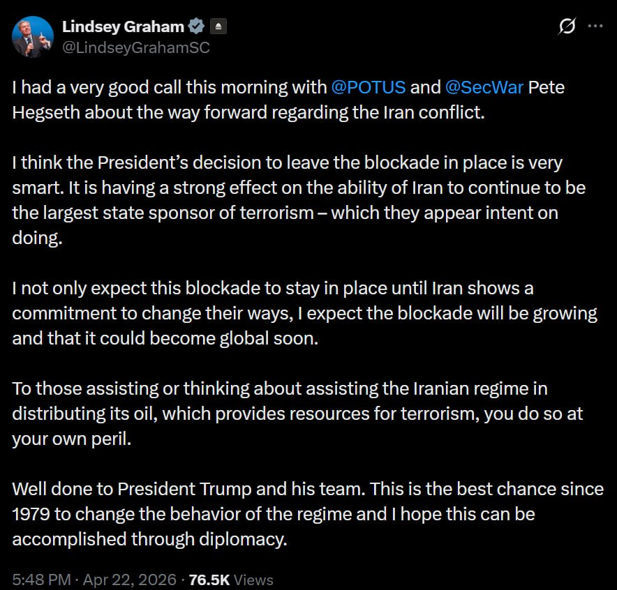 USA: Republican Senator and warmonger Senator Lindsey Graham said on X that the President’s decision to leave the blockade in place was smart because it was having a strong effect on the ability of Iran to continue to be the largest state sponsor of terrorism, not only expecting the blockade to stay in place until Iran showed a commitment to change their ways, but for it to be growing and noting that it could become global soon.