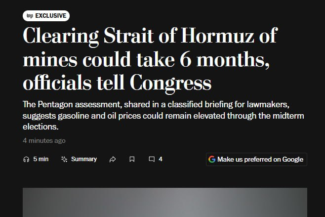 Clearing the Strait of Hormuz completely of mines could take up to six months according to the Pentagon, with operations unlikely to begin until the war with Iran ends, reported the Washington Post, stating that estimates were shared during a classified briefing to the House Armed Services Committee, where US lawmakers were told Iran may have placed more than 20 naval mines in and around the Strait, some deployed remotely using GPS technology to avoid detection, while others had been laid by small Iranian boats.