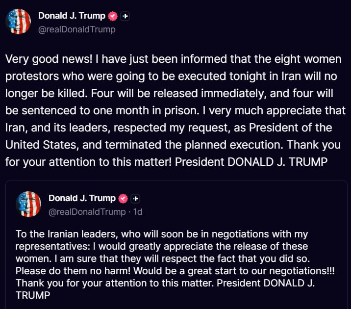 USA: President Trump took to Truth Social saying that great news had been received and Iran were due to release some of the women allegedly due to be killed on Wednesday, while others were going to be imprisoned for a month.