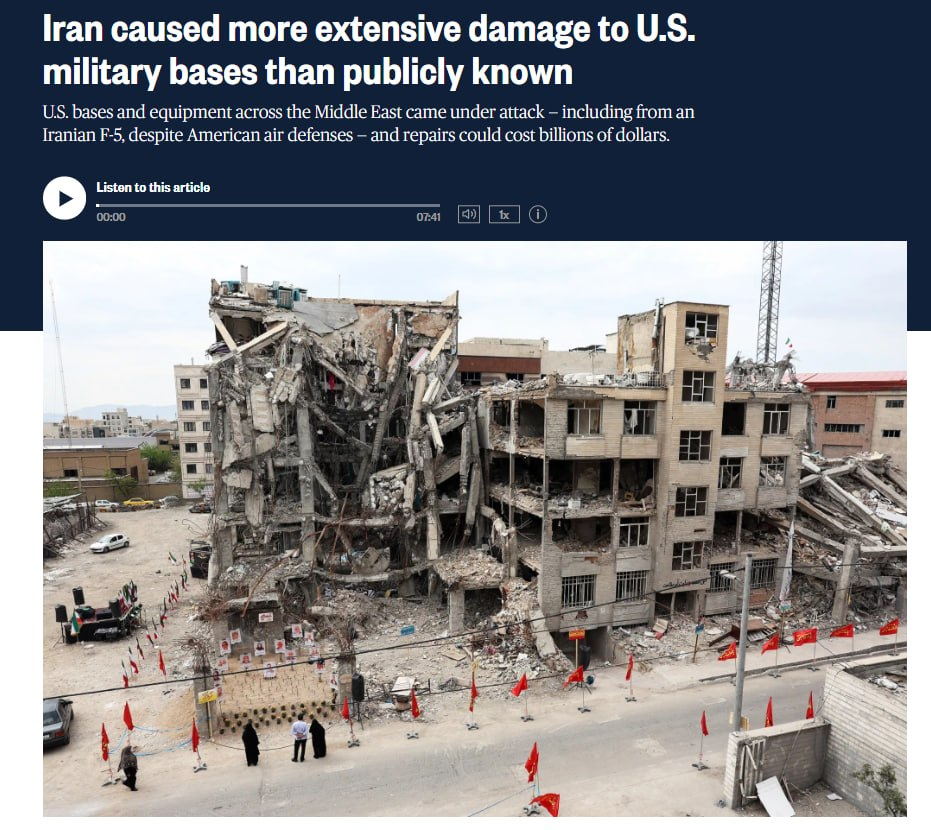USA: Iran inflicted significantly more damage on US military bases in the Middle East than has been publicly disclosed, US officials and congressional aides told NBC News, stating that US installations and equipment in the Gulf countries continuously came under attack, including from an Iranian F-5 fighter, despite American air defences, adding that the extent of the damage was said to be substantial, with repair costs potentially running into the billions of dollars.