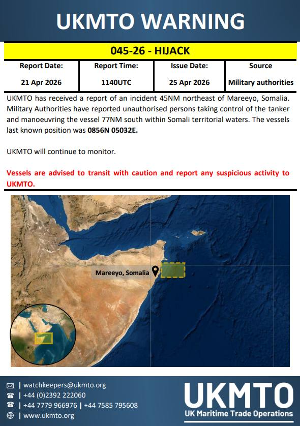 Somalia: Pirates hijacked the Honour 25 oil vessel around 45 nautical miles northeast of Marow, off the coast of Somalia along with its 17 crew members on Wednesday afternoon, according to security officials who spoke with the BBC, who stated that the vessel was carrying around 18,500 barrels of oil when t was captured, while noting the nationality of the 17 crew members included ten Pakistanis, four Indonesians, one Indian, one Sri Lankan, and one from Myanmar.