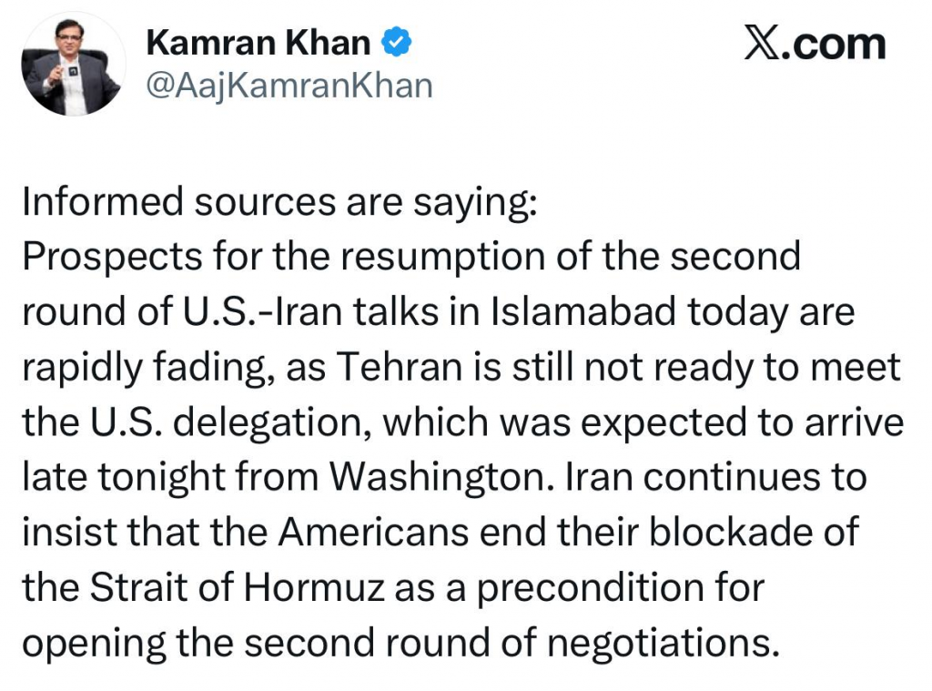 Journalist Kamran Khan claimed informed Pakistani sources had said the prospect for the resumption of the second round of talks are rapidly fading, as Tehran is still not ready to meet the US delegation, which was expected to arrive later tonight from Washington,” adding that Iran continued to insist the Americans ended their naval blockade as a precondition for opening the second round of talks.