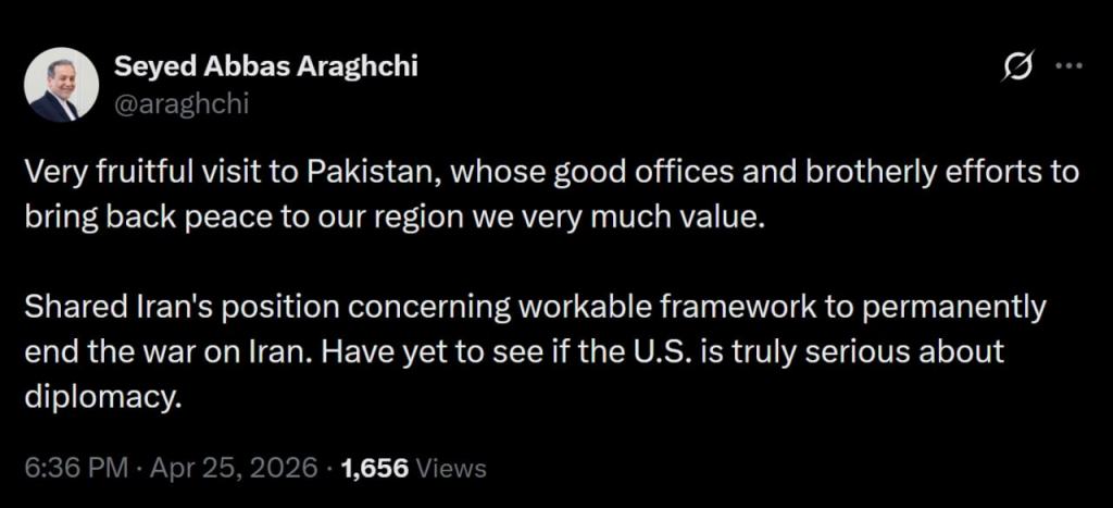 Taking to X, Araghchi said: “Very fruitful visit to Pakistan, whose good offices and brotherly efforts to bring back peace to our region we very much value. Shared Iran’s position concerning workable framework to permanently end the war in Iran, but have yet to see if the US is truly serious about diplomacy.”