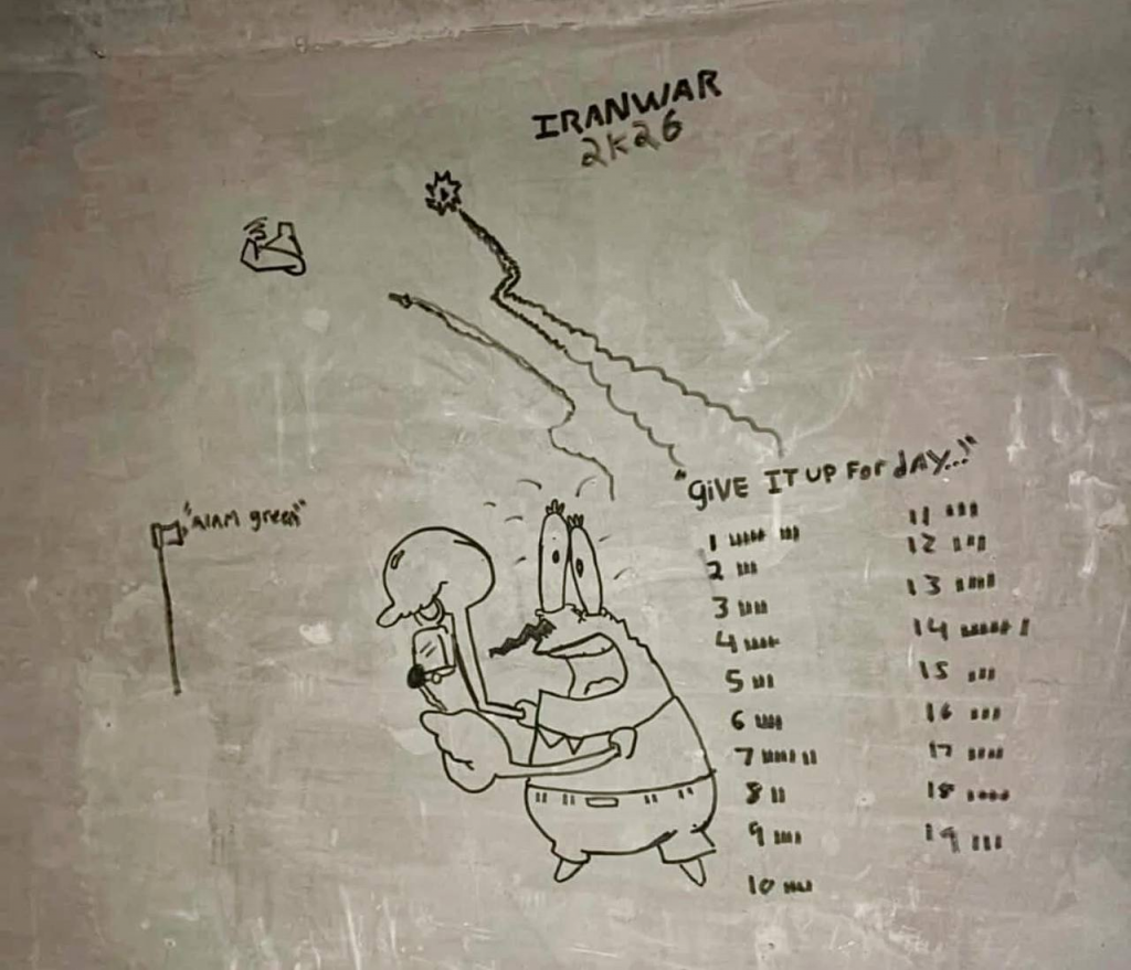 Jordan: A US servicemember who was stationed at the Muwaffaq Salti Air Base in Jordan drew artwork on the wall of a concrete shelter they were forced to use, illustrating Iranian projectiles and marking 78 drone and missile attacks on the base between February 28 and March 19.