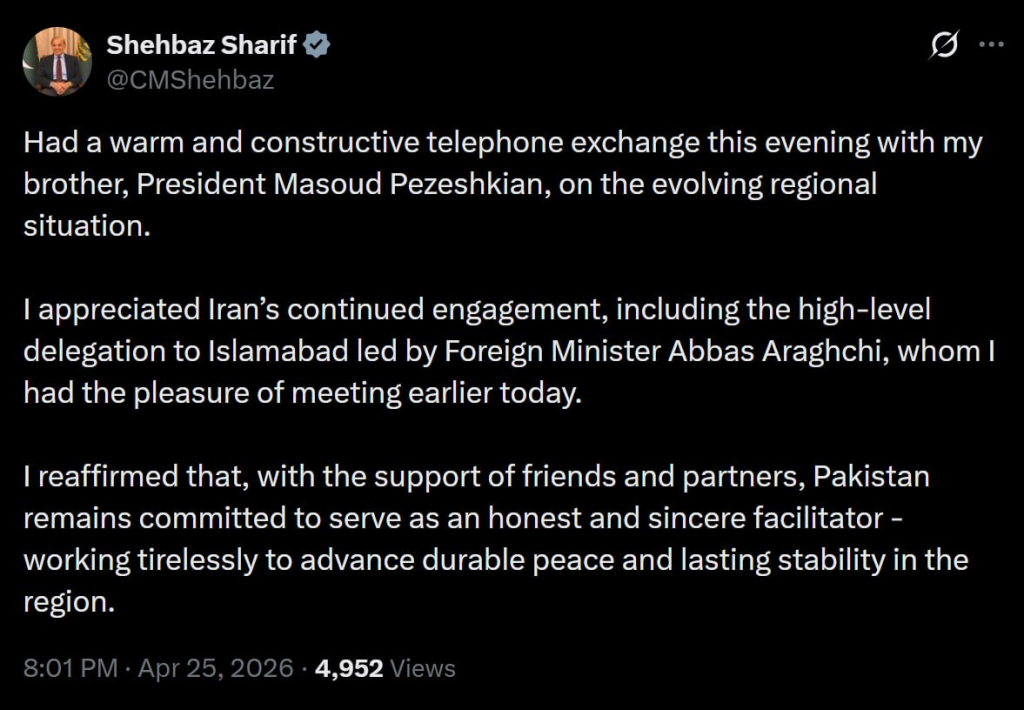 Pakistan: Prime Minister Shehbaz wrote on X that he had shared a warm and constructive telephone exchange with Iranian President Masoud Pezeshkian on the evolving regional situation, in which he appreciated Iran’s engagement, including the high-level delegation to Islamabad led by FM Araghchi who he had met earlier on Saturday, while reaffirming, with the support of friends and partners, Pakistan remained committed to serve as an honest and sincere facilitator – working tirelessly to advance durable peace and lasting stability in the region.