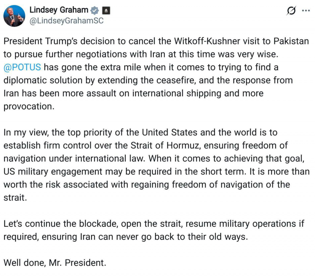 USA: Senator Lindsey Graham, who is always pushing for war, wrote on X that President Trump’s decision to cancel the US delegation to Pakistan to pursue further negotiations with Iran at this juncture was very wise, stating that the siege should continue to reopen the strait, and the resumption of military operations too if necessary, to ensure that Iran could never return to its old ways.