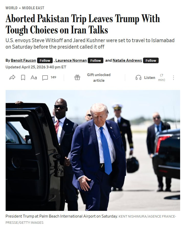 President Trump must have received Iran’s position from Pakistan early, because although the NYT were quick to report that Special Envoy Steve Witkoff and Jared Kushner were due to arrive in Islamabad on Saturday morning around the same time as the Iranian delegation was there, Trump had cancelled the travel plans, telling Fox News there was no point sending the delegation on an 18-hour flight for talks that would lead to nowhere, that Iran had the number for the USA, and can get in touch when they’re ready to make a deal, adding that the United States was already holding all the cards. Trump later confirmed in a phone call to Axios that the trip was cancelled due to the Iranian position in the negotiations, likely referring to the 10-point plan that would have been received from Pakistan.