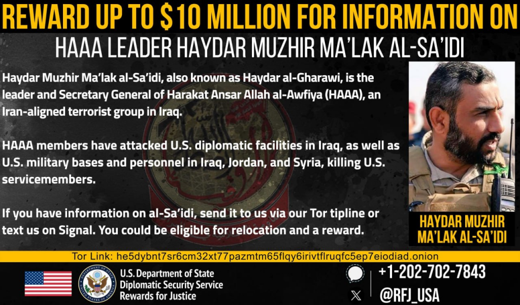 Iraq: The US State Department is offering a reward of up to $10 million for information on the leader of the Iranian-aligned Ansar Allah al-Awfiya, Haydar Muzhir Ma’lak Al-Sa’idi, because of the groups attacks of US diplomatic facilities and military bases in the region.