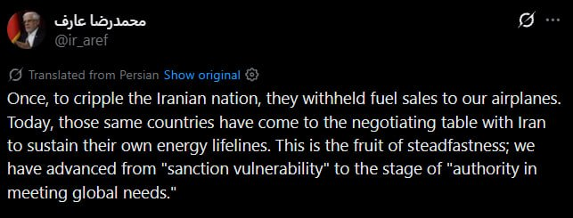 Iran: Vice President Mohammad Reza Aref said on X that the US tried to cripple the Iranian nation by withholding fuel sale for airplanes, but today those same countries have come to the negotiating table with Iran to sustain their own energy lifelines, stating that Iran had advanced from ‘sanction vulnerability’ to the stage of ‘authority in meeting global needs.’