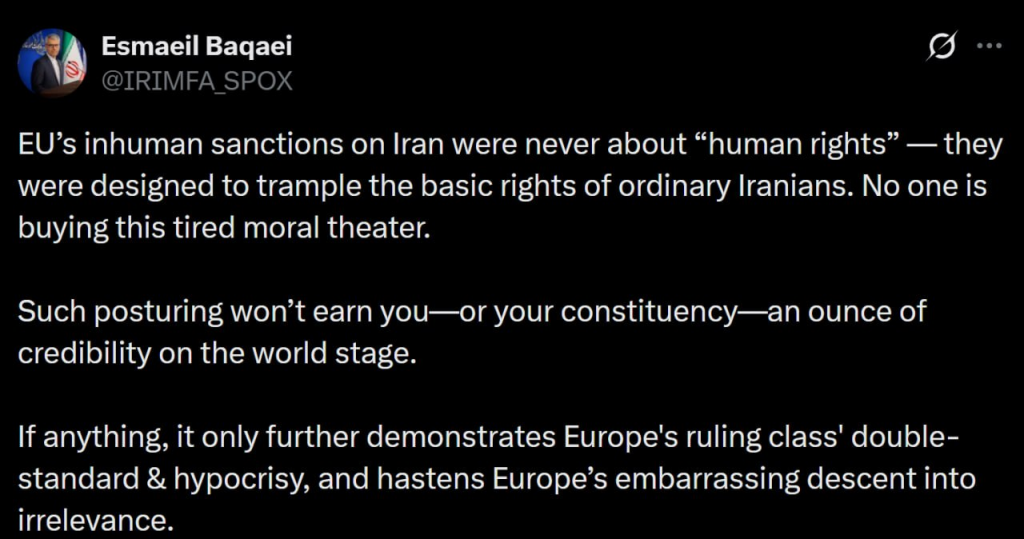 Iran: Foreign Ministry spokesman Esmaeil Baghaei said on Monday that the EU’s inhumane sanctions on Iran were never about ‘human rights’ and more designed to trample the basic rights of ordinary Iranians, so no one was buying the tired moral theatrics of von der Leyen, claiming posturing won’t earn anyone an ounce of credibility on the world stage, and if anything, it only further demonstrated Europe’s ruling class’ double-standard and hypocrisy, and hastened Europe’s embarrassing descent into irrelevance.
