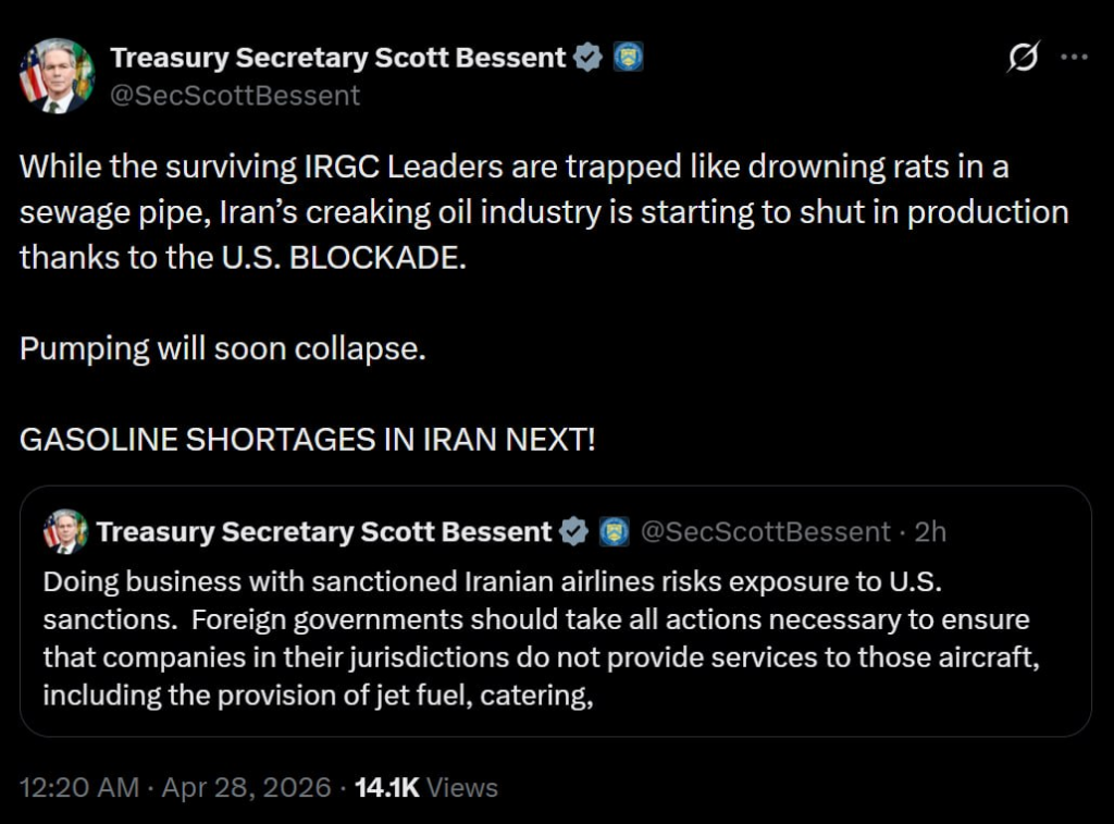 USA: Treasury Secretary Scott Bessent claimed on X that the surviving IRGC Leaders were trapped like drowning rats in a sewage pipe, while Iran’s creaking oil industry was starting to shut in production thanks to the US blockade.