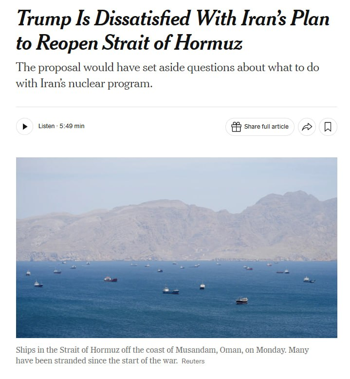 President Donald Trump had reviewed a 3-point proposal from Iran which was discussed with advisers, and said afterwards that he was dissatisfied with Iran’s proposal to reopen the Strait of Hormuz and end the war, particularly because it sidestepped the issue of Iran’s nuclear program and called for lifting the US Naval blockade, according to NYT, but while Trump hadn’t rejected it outright, he continued to insist Iran must not obtain nuclear weapons, leading to some officials warning that accepting the deal could undermine a clear US victory.