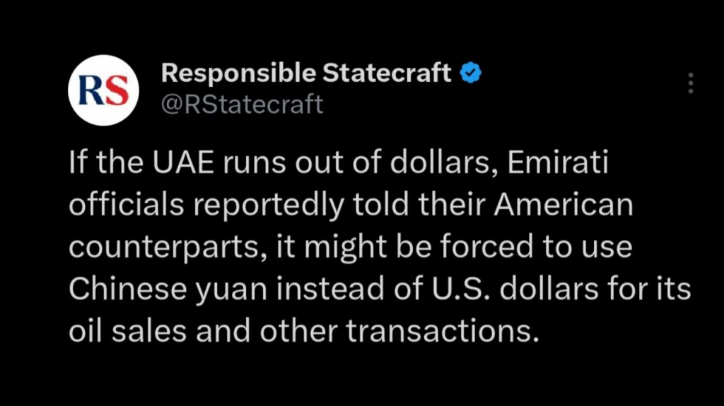 Senior Emirati officials have told their American counterparts that if the UAE’s dollars run out, they could be forced to use the Chinese yuan instead of the US dollar for selling oil and other transactions, Irib News reported.