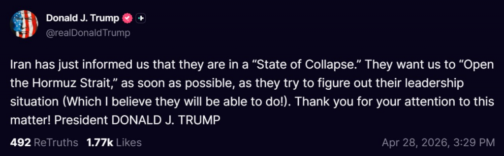 An attempt to add extra pressure on Iran by President Trump included a Truth Social on Tuesday saying that Iran had informed the US they were in a ‘state of collapse,’ claiming they want the US to open the Hormuz Strait ‘as soon as possible,’ as they try to figure out their leadership situation.
