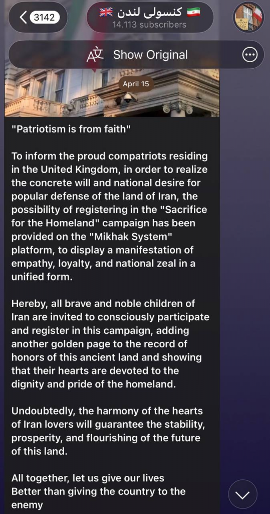 The UK Foreign Office summoned the Iranian ambassador to London over what it described as the Iranian Embassy’s ‘unacceptable and inflammatory’ social media comments, stating that the Embassy must cease any communications that could be interpreted as encouraging violence in the UK or internationally, without specifying what posts it was referring to, however, the Iranian Embassy had posted a message on its Telegram channel on April 15 calling on Iranians in the UK to volunteer for a campaign declaring their willingness to sacrifice their lives in defence of Iran.