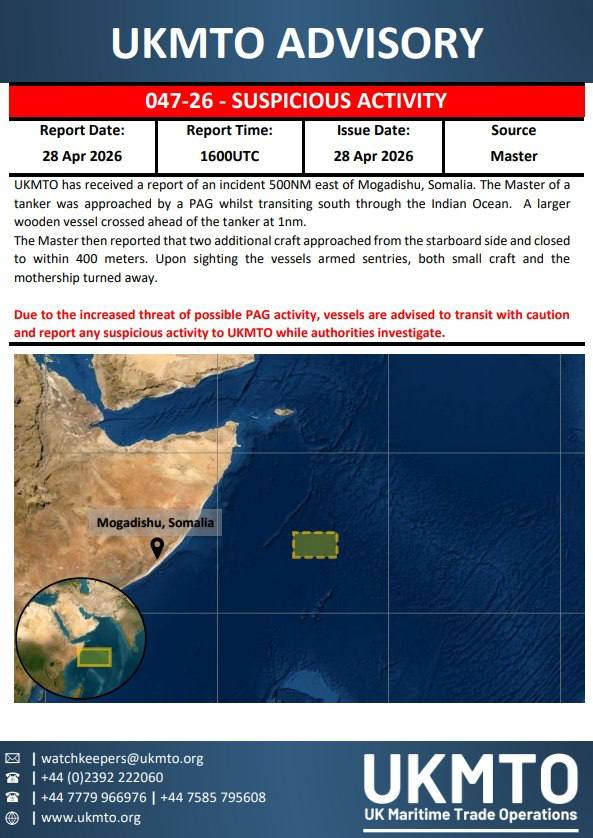 UKTMO received a report of an incident that occurred 500 nautical miles east of Mogadishu, Somalia, stating that a group of patrol ships approached an oil tanker’s captain while it was crossing the Indian Ocean southbound, when a larger wooden ship crossed in front of the tanker at a distance of one nautical mile, and the captain then reported that two additional boats approached from the right side which came to a distance of around 400 metres before seeing armed guards, at which point both the small boats and the mother ship retreated.