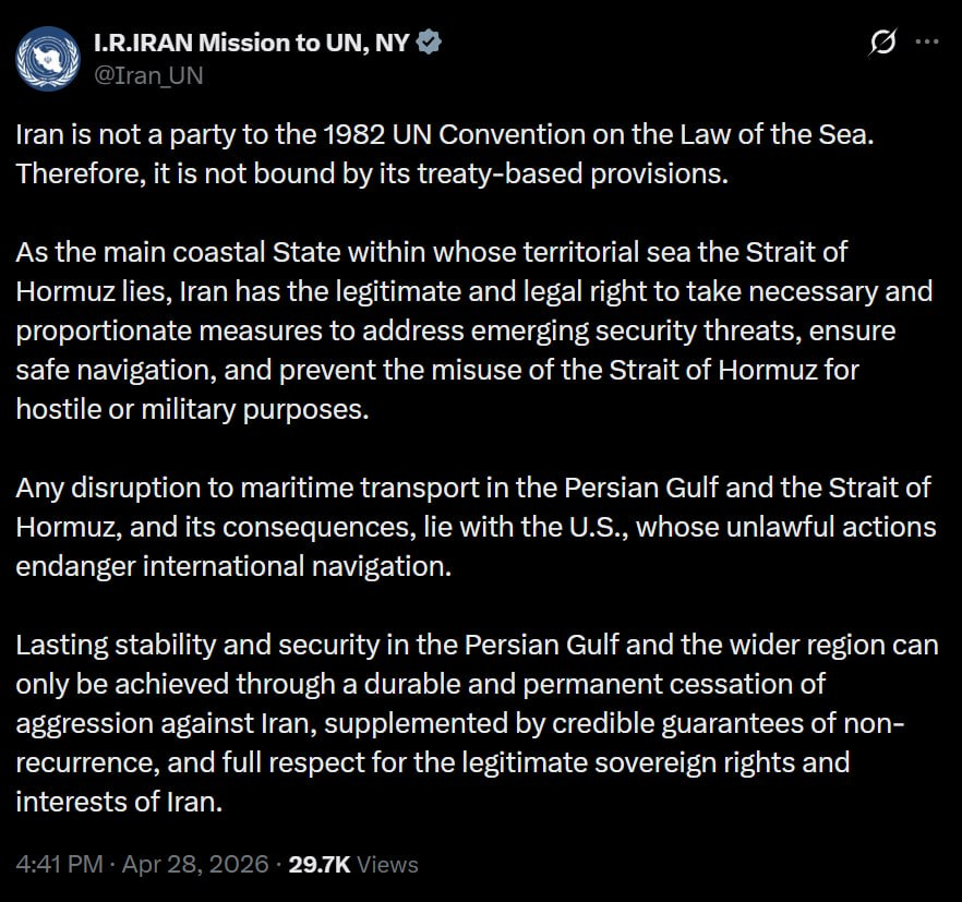 The Iranian Mission to the UN published a lengthy post on X stating that because Iran was not party to the 1982 UN Convention on the Law of the Sea, it is not bound by its treaty-based provisions, stating that any disruption to maritime transport in the Persian Gulf and the Strait of Hormuz, and its consequences, lie with the US, whose unlawful actions endangered international navigation.