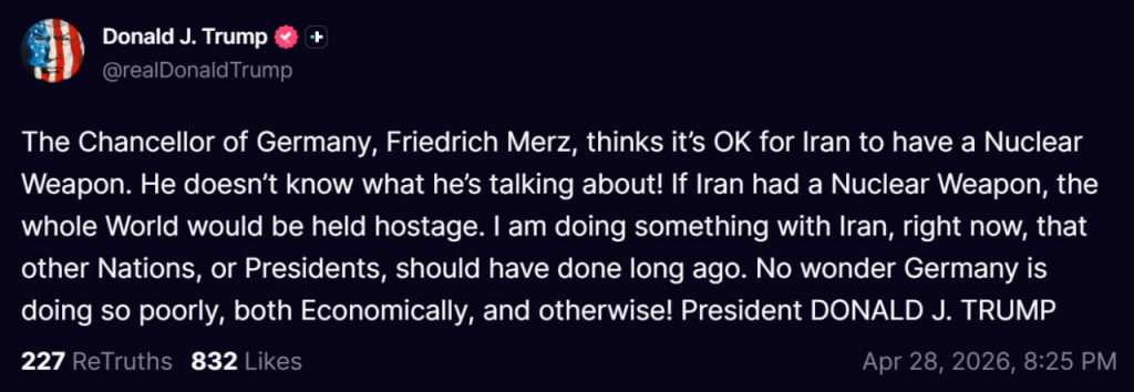 President Trump said on Truth Social that the Chancellor of Germany Friedrich Merz appeared to think it was ok for Iran to have a nuclear weapon, claiming the official didn’t know what he was talking about: “If Iran had a nuclear weapon, the whole world would be held hostage,” he said, claiming he was doing something right with Iran, something that other presidents or nations should have done long ago, before taking direct aim at Germany: “No wonder Germany is doing so poorly, both economically, and otherwise,” he wrote.