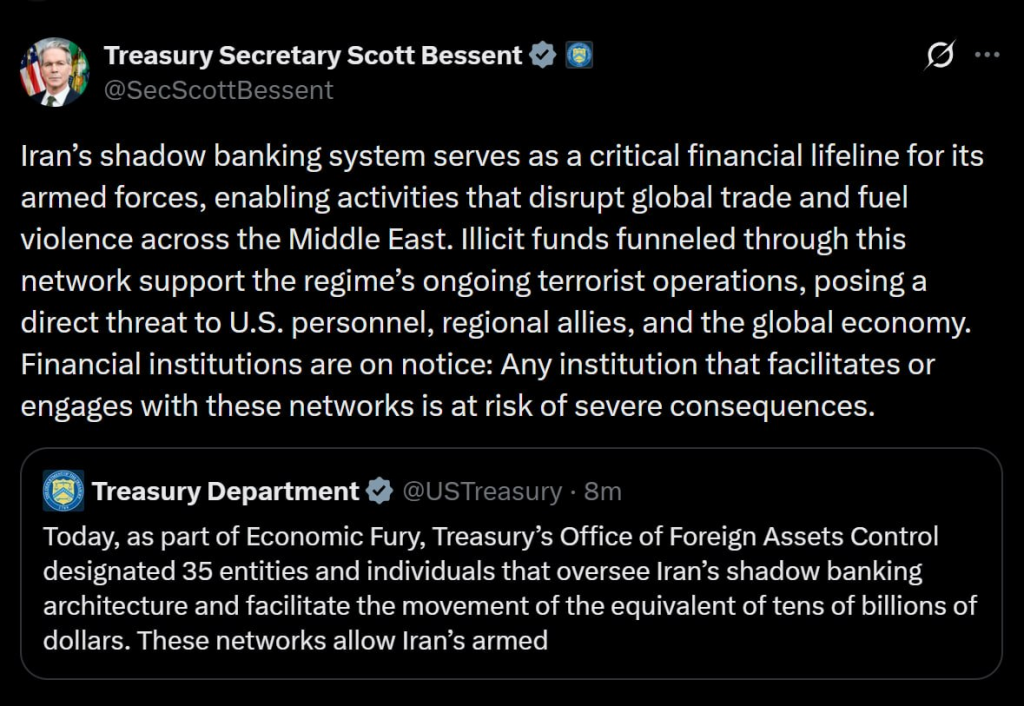 US Treasury Secretary Scott Bessent said on X that Iran’s shadow banking system served as a critical financial lifeline for its armed forces, enabling activities that disrupted the global trade and fuelled violence across the Middle East, stating that financial institutions were now on notice, because any institution that facilitates or negotiates with any of the sanctioned networks was at risk of severe consequences, adding that 35 designated entities and individuals that ‘oversee Iran’s shadow banking architecture and facilitate the movement of the equivalent of tens of billions of dollars’ had been sanctioned by the US Department of the Treasury Office of Foreign Assets Control.