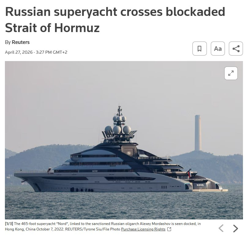A $500 million superyacht linked to Russian billionaire Alexey Mordashov sailed through the Strait of Hormuz after undergoing maintenance in Dubai, Reuters reported, stating that the 142-metre yacht Nord, sailing under a Russian flag, crossed the Strait without objection from either side, departing Dubai on Friday, crossing the Strait on Saturday morning, and arriving in Muscat early on Sunday.