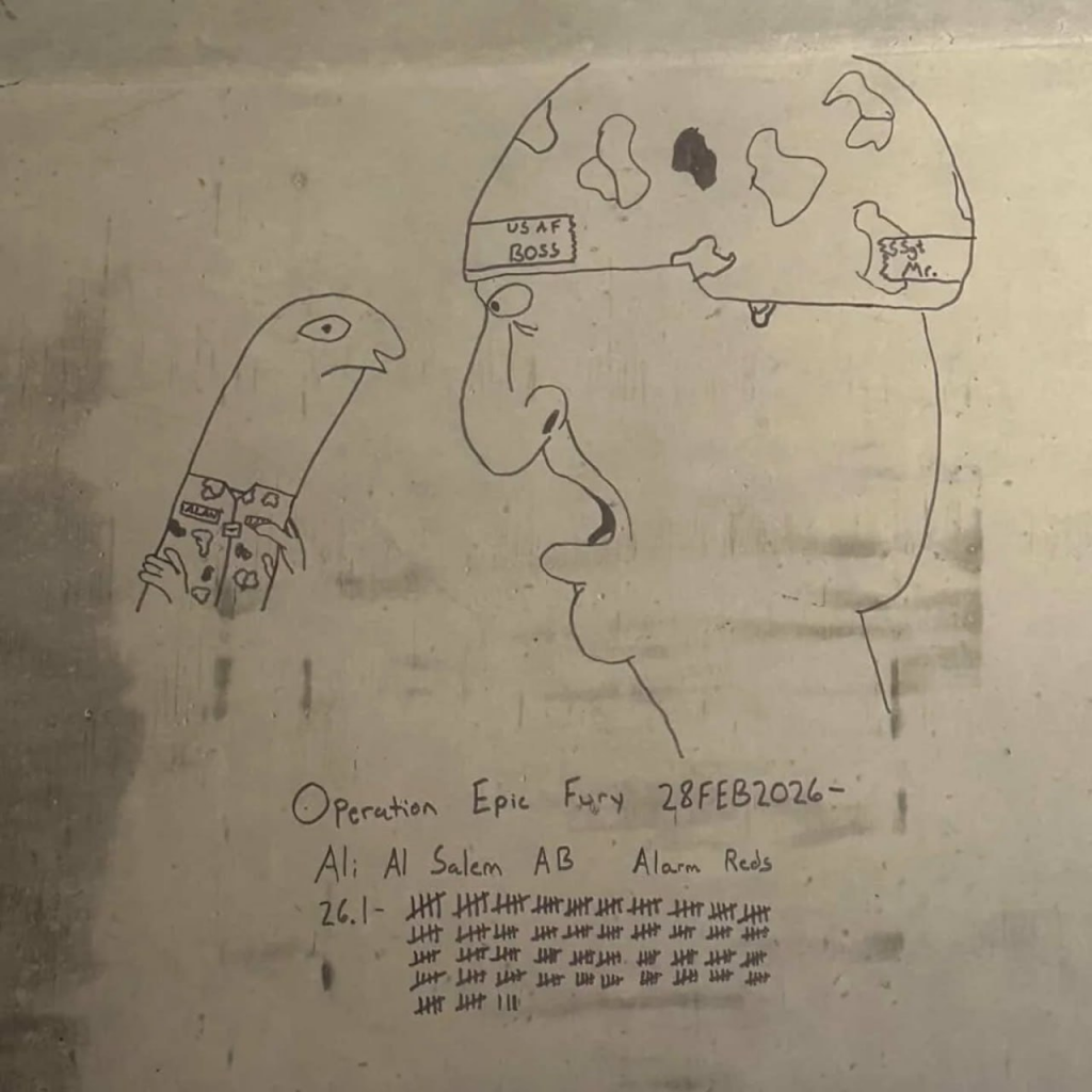 Following on from artwork from Jordan which was shared on AJ News recap from Day 17 here, the US troops at the Ali Al Salem Air Base in Kuwait also draw pictures on the wall highlighting their times spent in the shelter, which noted more than 210 air raid alerts had been sounded during the timeframe.