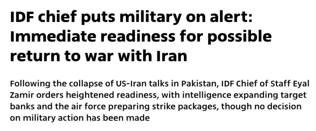IDF Chief of Staff Eyal Zamir placed the military on immediate high alert following the collapse of negotiations in Pakistan, citing the possibility of a return to war, reported Ynet, stating the IDF was increasing readiness, with intelligence units expanding target lists and the air force preparing strike plans, although no final decision on military action had been made, although Channel 14 Israel later reported that Israel would not return to fighting Iran alone.