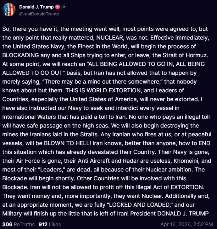 Trump posted another Truth Social shortly after, saying that most points had been agreed with Iran, but the only sticking point was the nuclear issue, which now warrants the US to blockade the Persian Gulf for all ships heading to and from Iranian ports, according to Trump, noting that the US were fully ‘locked and loaded’ in a caution to Iran regards breaking the ceasefire.